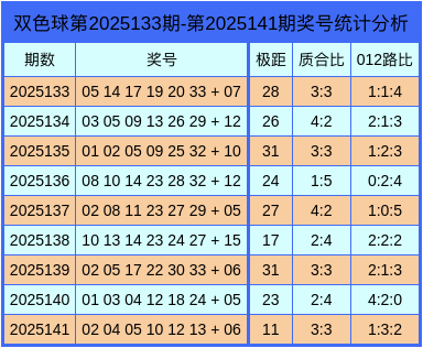 上期回顾:双色球第2025141期回顾:红球02、04、05、10、12、13 + 蓝球06。