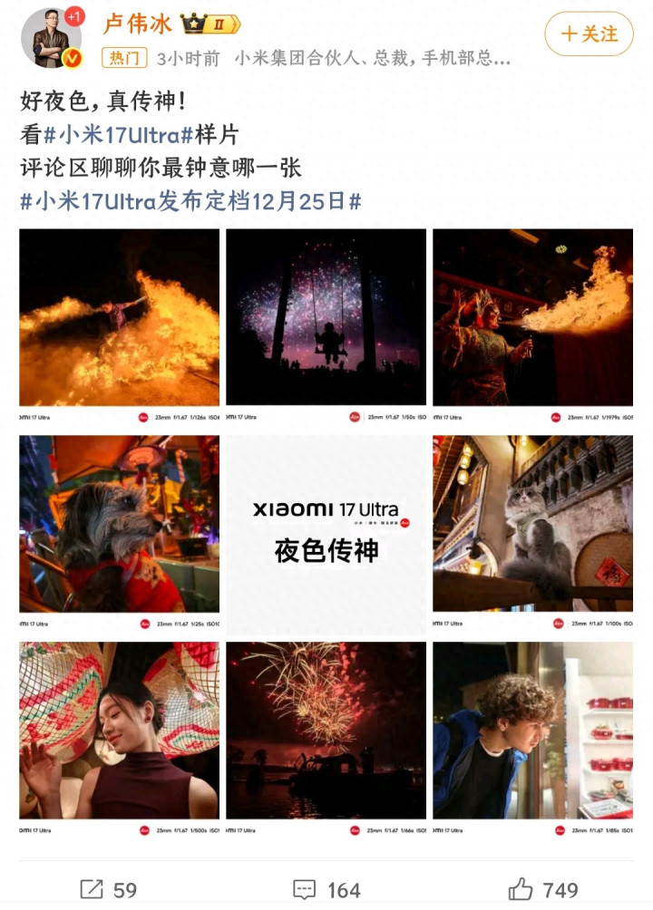 12月22日,小米手机官方微博同步放出小米17 Ultra的拍照及视频样片,同时小米集团高管卢伟冰首次晒出该机真机,两大重磅信息让这款即将发布的旗舰机型成为焦点。该机定于12月25日正式亮相,此次提前公布的核心亮点集中在影像升级与机身设计突破。