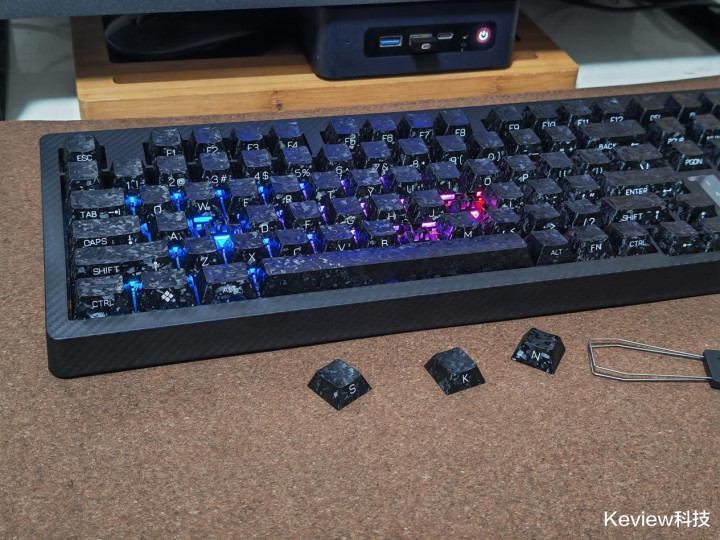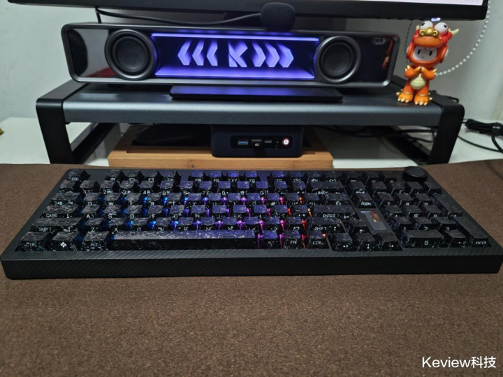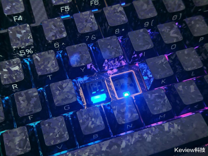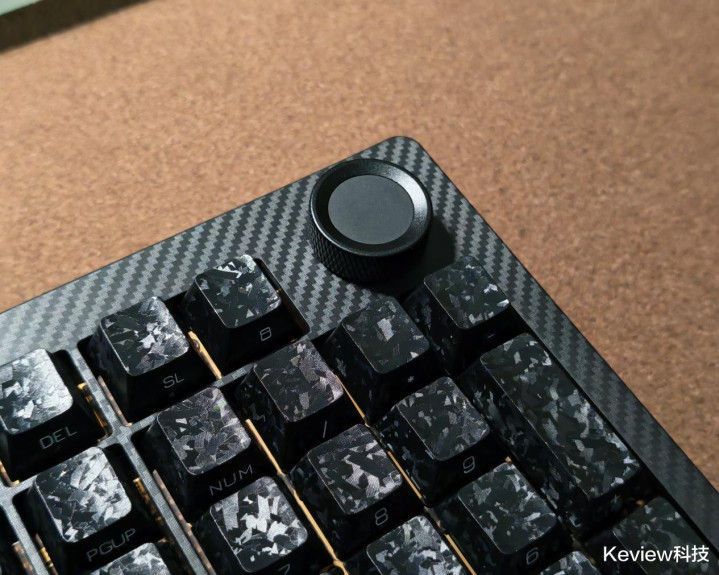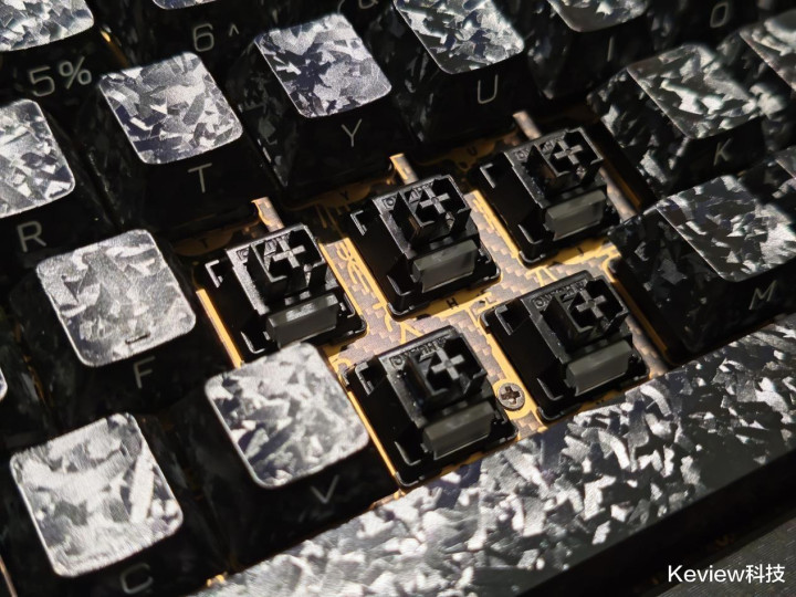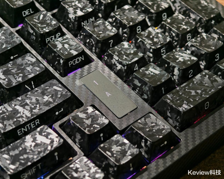 惊碳最大的亮点就是碳纤悬浮式无底壳的设计,PCB主体结构完全悬浮在框架结构上,没有传统外壳的腔体结构,从物理层面就解决了腔体共振问题,消除传统腔体的共振杂音,敲击时声音更干净。