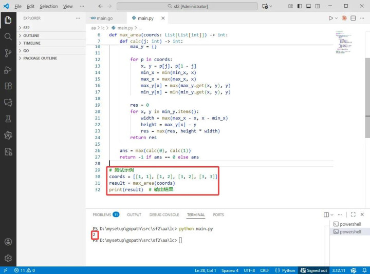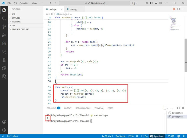 2025-12-02:找到最大三角形面积。用go语言,给出一个大小为 n×2 的二维数组 coords,表示平面上 n 个点的坐标。任务是从这些点中任取三点构成三角形,并且要求该三角形至少有一条边与 x 轴或 y 轴平行。求所有满足条件的三角形中面积最大的那个的两倍(即 2A),若不存在符合条件且面积非零的三角形则返回 -1。